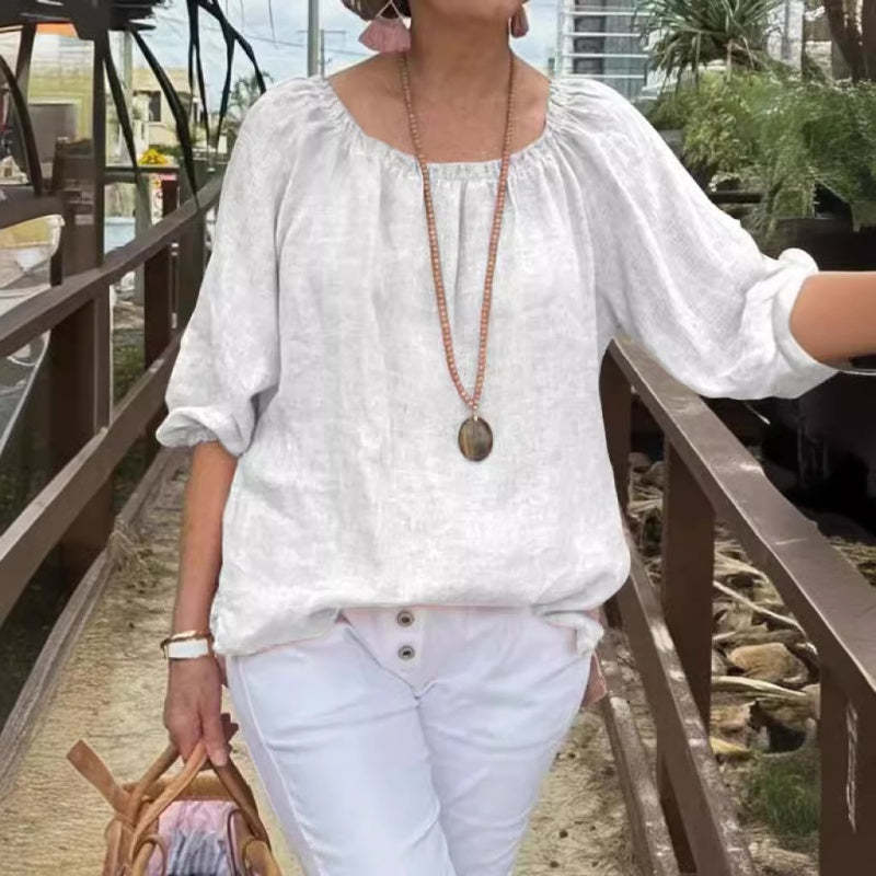 Damski top z okrągłym dekoltem i średnim rękawem, wykonany z bawełny i lnu
