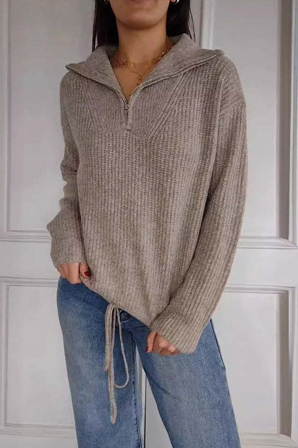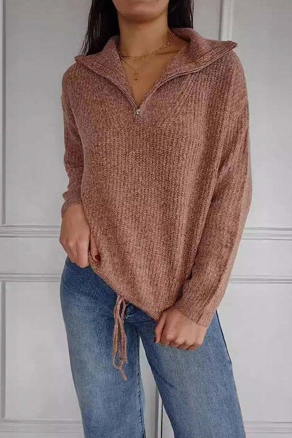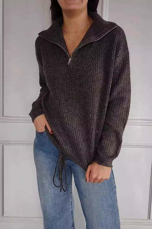 Damski, dzianinowy top z klapami, zamkiem błyskawicznym i długim rękawem