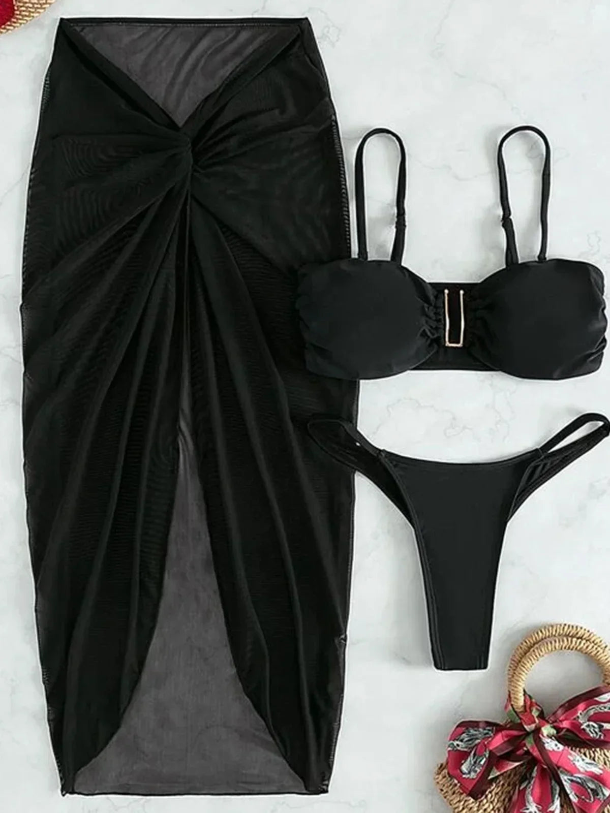 💕Pomarszczony, wysoko wycięty zestaw bikini z Sarongiem – 3-częściowy damski strój kąpielowy👙
