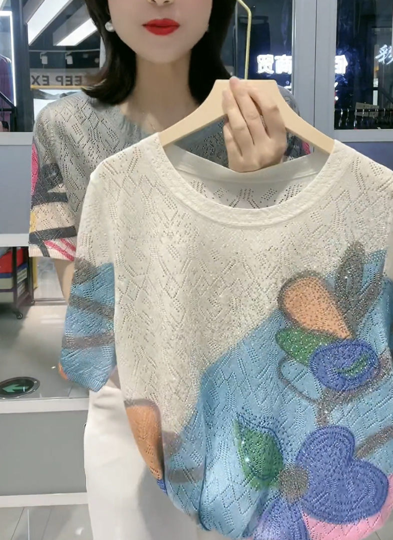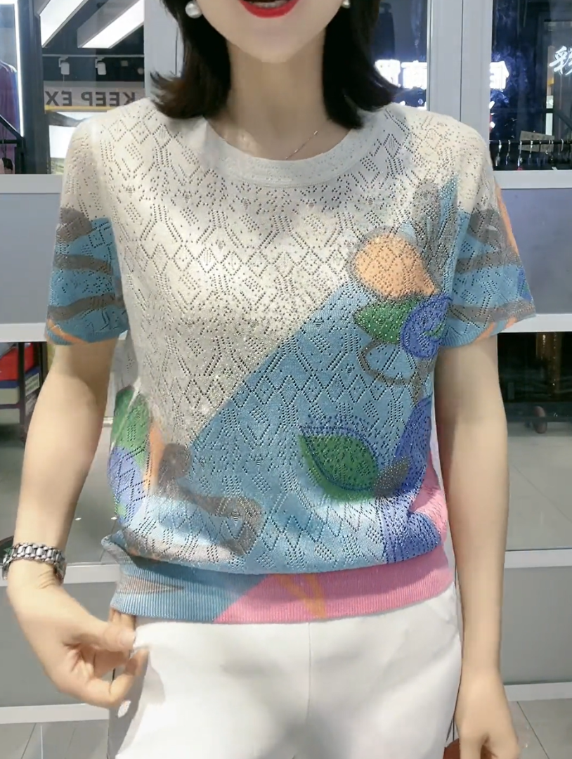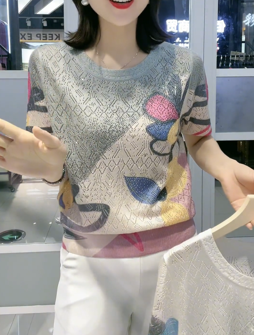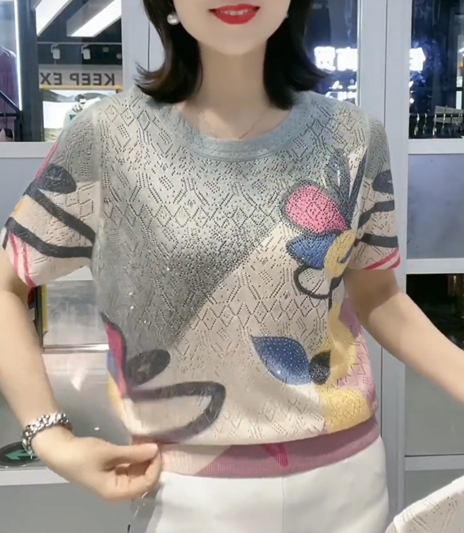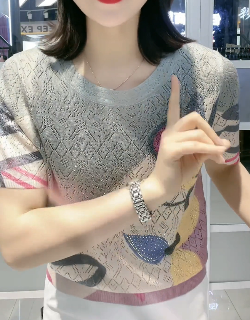 【L-5XL】👚 Nowa modna koszulka z okrągłym kołnierzykiem i diamentowym wzorem, uniwersalna i dopasowana
