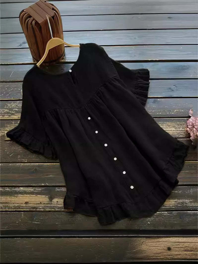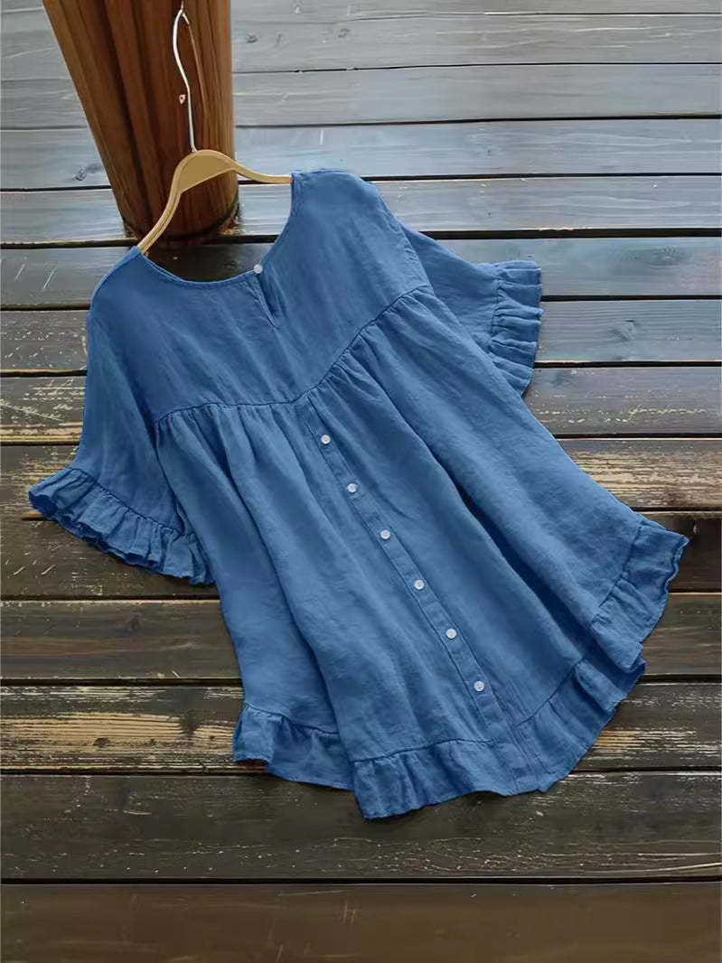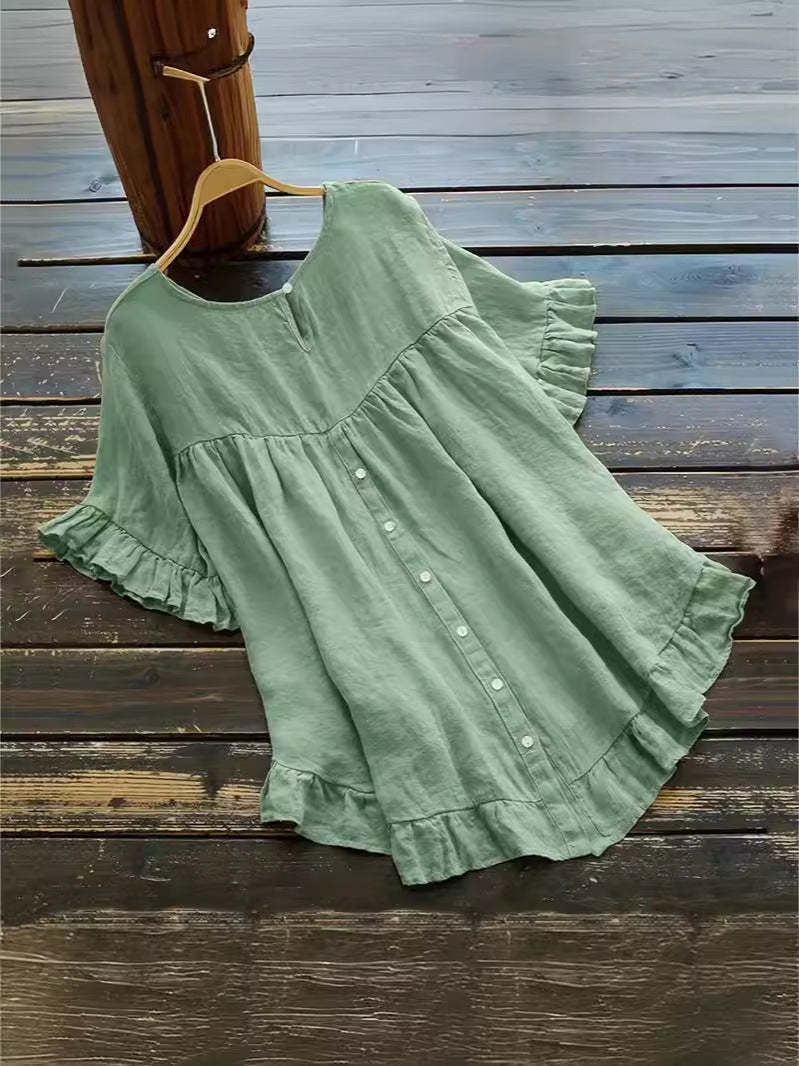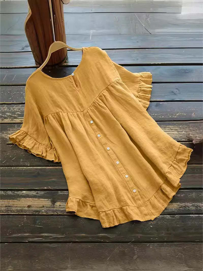 Zapinana na guziki koszula z bawełny i lnu z falbaną