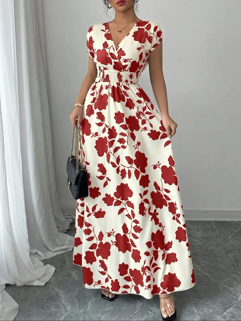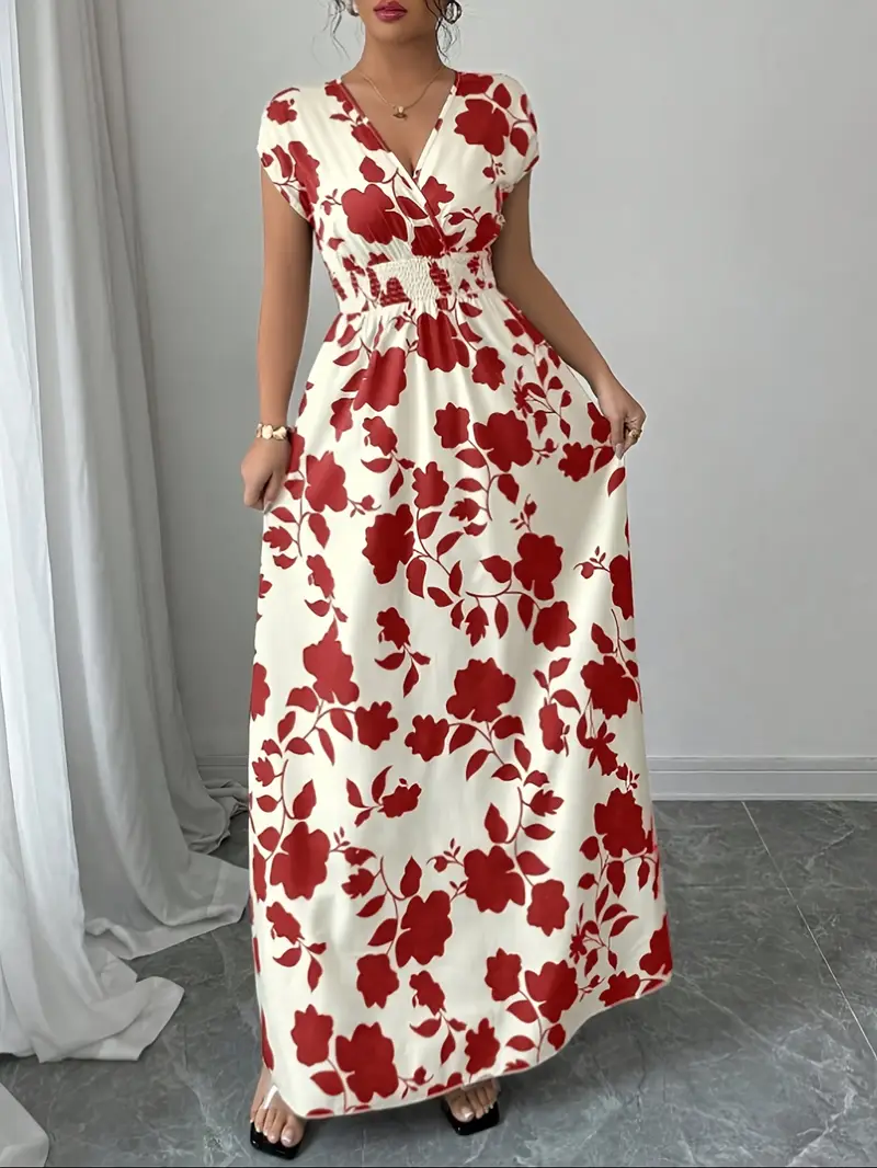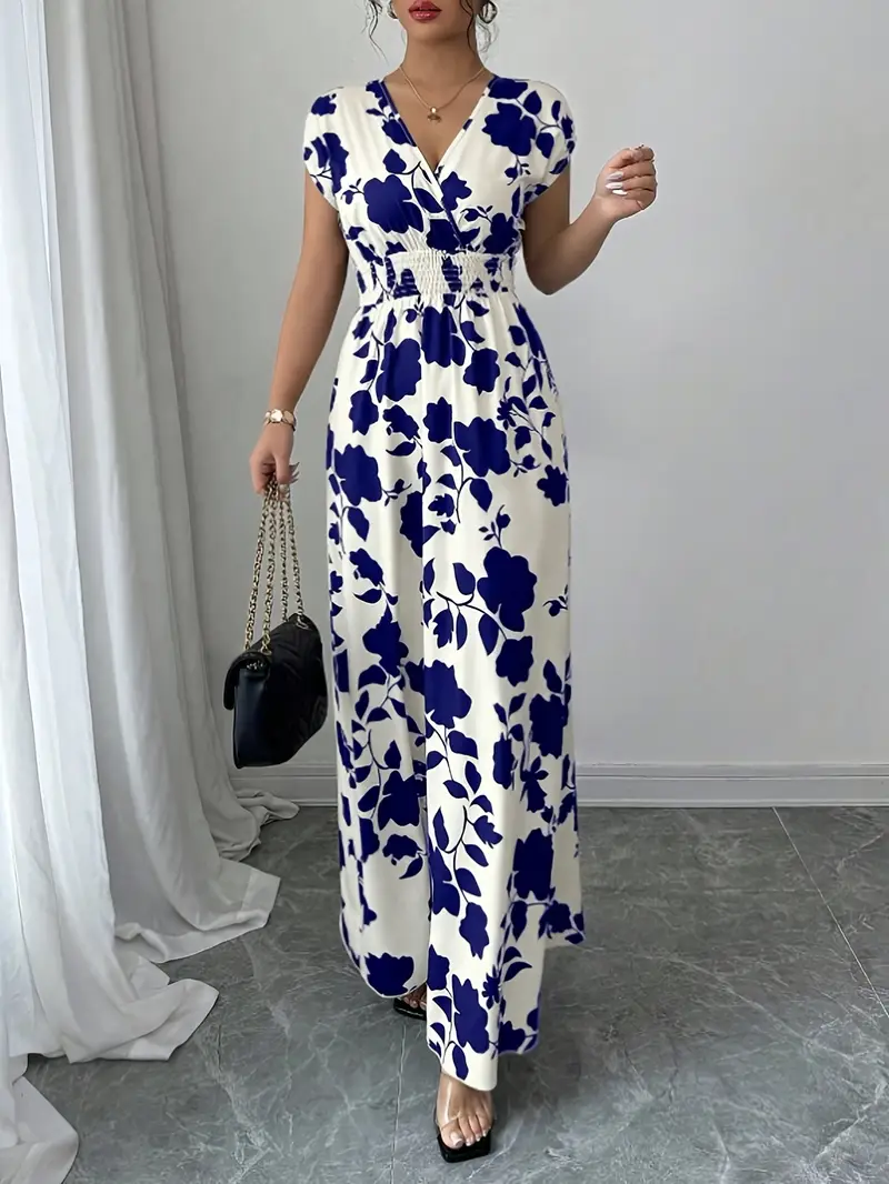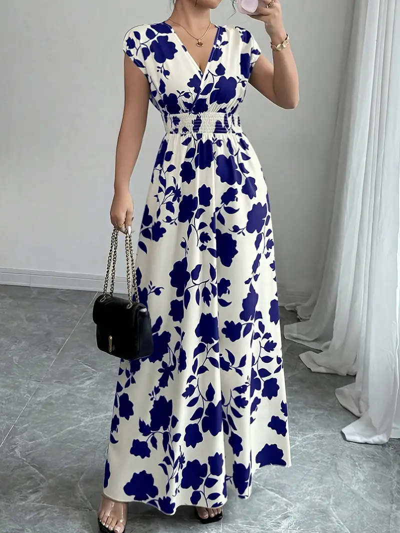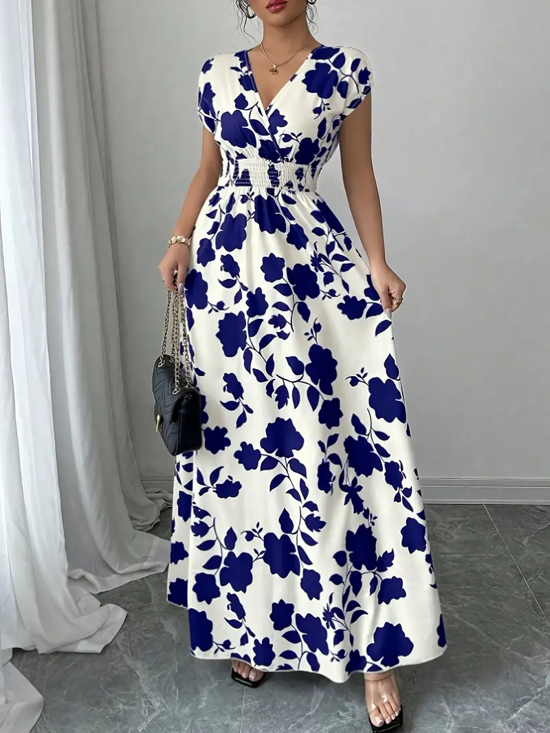 💜 Sukienka damska maxi z kwiatowym nadrukiem i dekoltem w serek