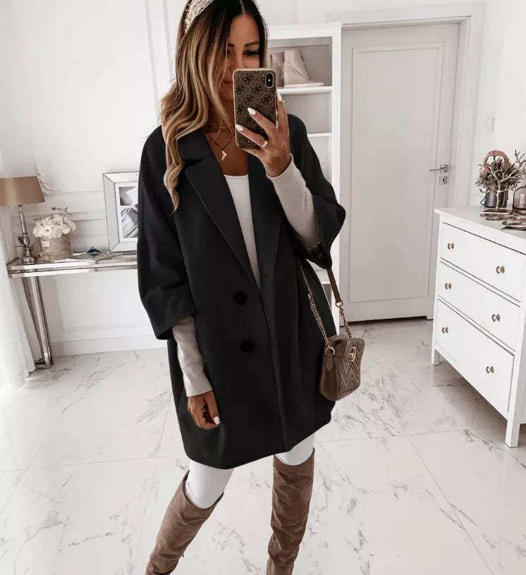 Płaszcz z klapami w jednolitym kolorze, z kieszenią i guzikami 💖