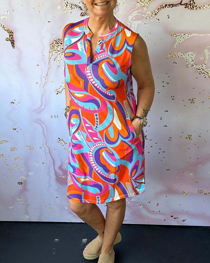 Sukienka z nadrukiem, bez rękawów, ze stójką i kieszeniami